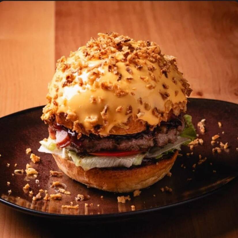 Булка бріош/салат айсберг/котлета ялова/бекон/помідор/цибулевий конфітюр/соус BBQ/соус сирний/цибулевий кранч.