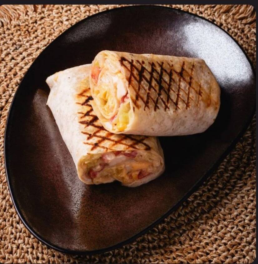 Тортилья пшенична/соус Айолі/салат айсберг/кукурудза/ананас/цибуля синя маринована/помідор/куряче філе/квасоля червона/соус сирний.