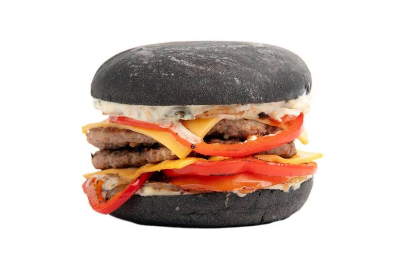 Булка пшенична чорна, соус Смеш білий, папріка червона, помідор, цибуля ріпчата, котлета ялова, сир тостовий, карамелізована цибуля