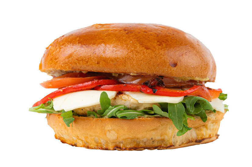 Бургер Гриль Песто — соковита куряча котлета, ароматні овочі гриль (паприка та томат), ніжний сир сулугуні та свіжа рукола. Доповнюється соусом песто та подається в підсмаженій булці для насиченого, яскравого смаку.