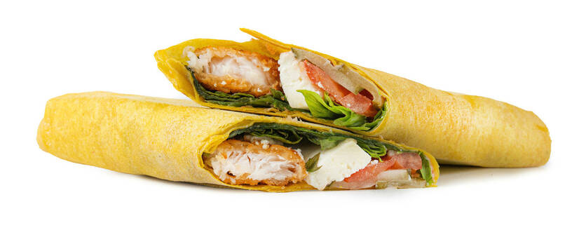 соковита котлета з хека у хрусткій скоринці, поєднана зі свіжими овочами, ніжним адигейським сиром та фірмовим соусом. Загортається у лаваш і підсмажується на грилі до рум’яної скоринки.