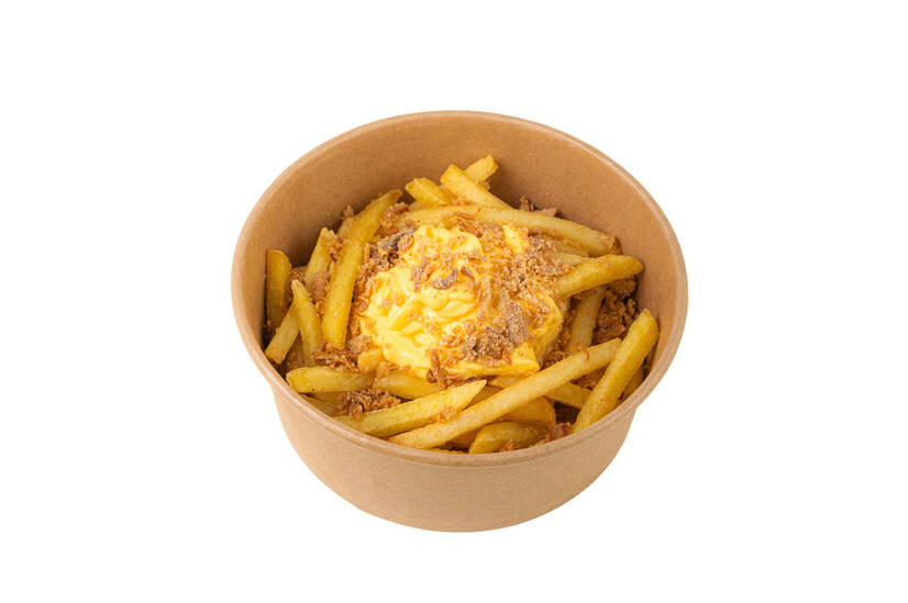 золотиста хрустка картопля фрі з ніжною серединкою, доповнена соусом та ароматною карамелізованою цибулею. Ідеальний варіант для швидкого та смачного перекусу.