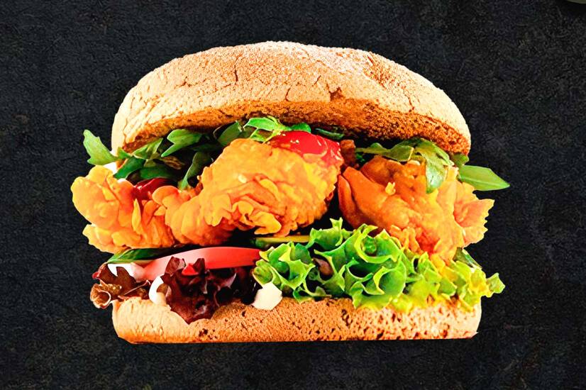 Булка пшенично-житня, стріпси, майонез, кетчуп, листя салату, огірок, помідор