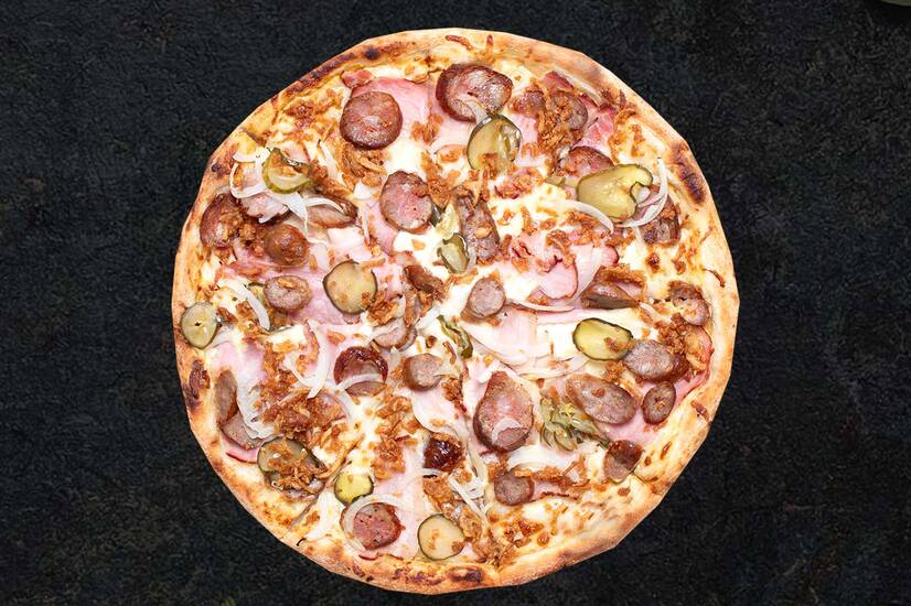 Соус білий,гірчиця моцарелла, бекон, ковб.домашня,цибуля, огірок сол.,цибулька смаж