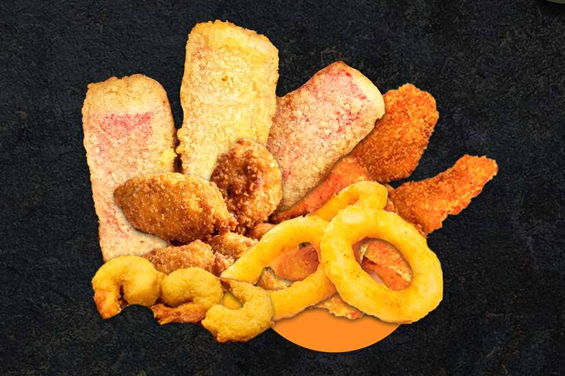 Рибний стріпс-3 шт, кальмар кільце-3 шт, мідії в паніровці-5 шт, сніжний краб-2 шт, креветка в паніровці-3шт