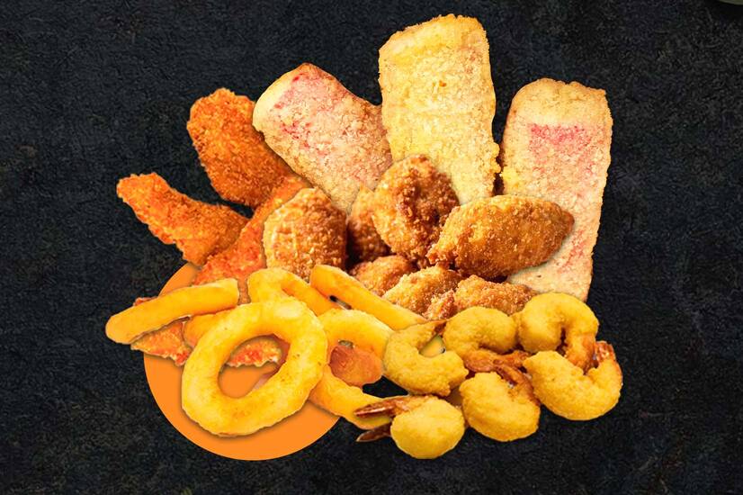 Рибний стріпс-3 шт, кальмар кільце-6 шт, мідії в паніровці-10 шт, сніжний краб-4 шт, креветка в паніровці-6шт