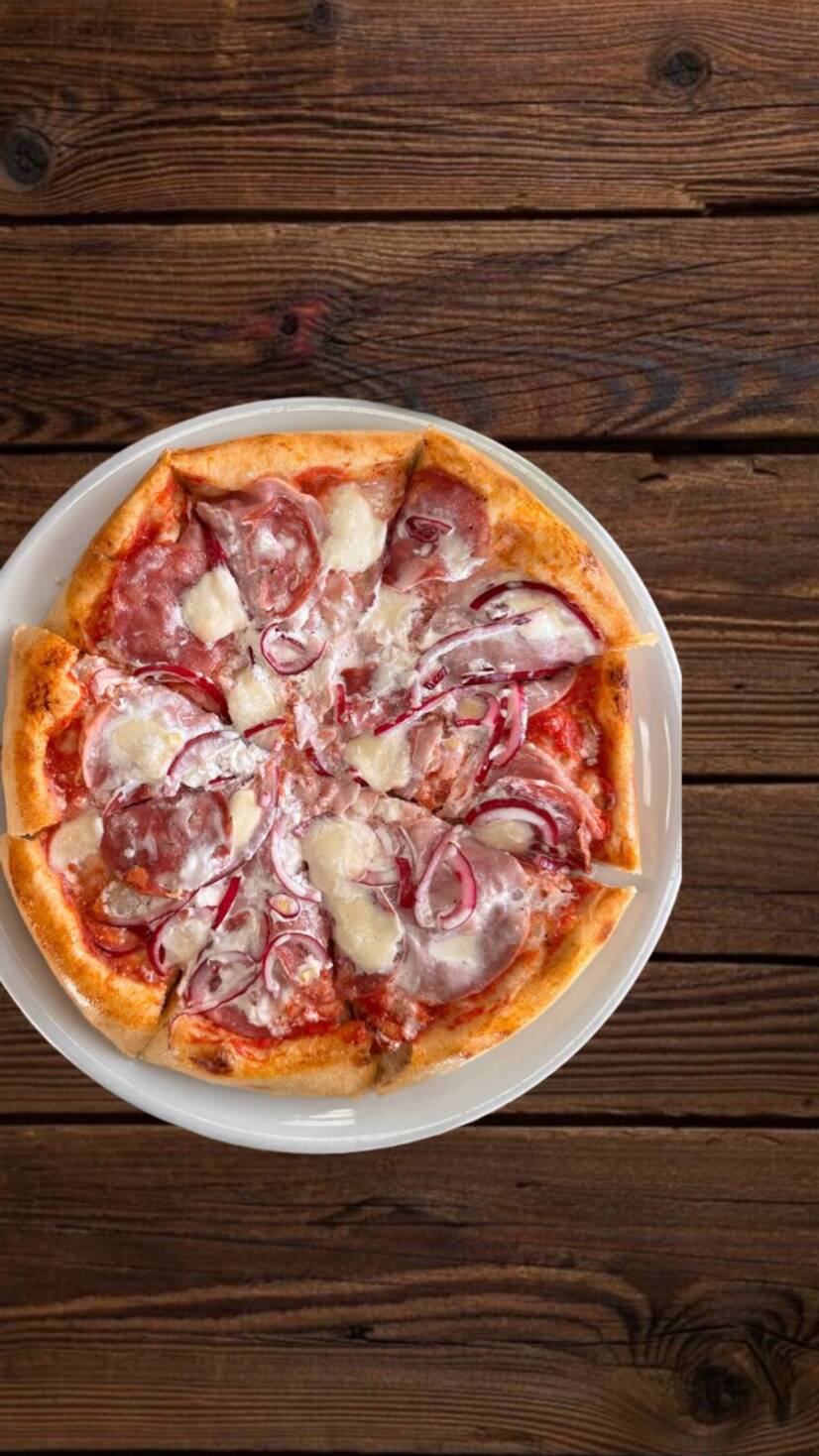 Соус томатний , панчета , салямі , шинка, червона цибуля , вершки, сир моцарела