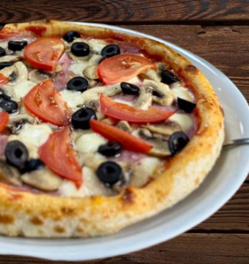 Томатний соус , моцарела , смажені печериці , шинка ,помідори , маслини ,червона цибуля