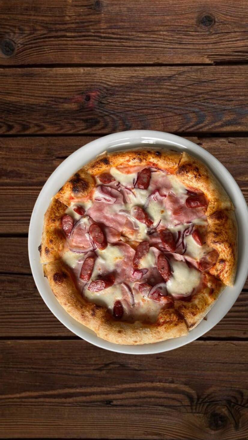 Соус томатний, моцарелла, мисливські ковбаски, шинка, маринована червона цибуля.