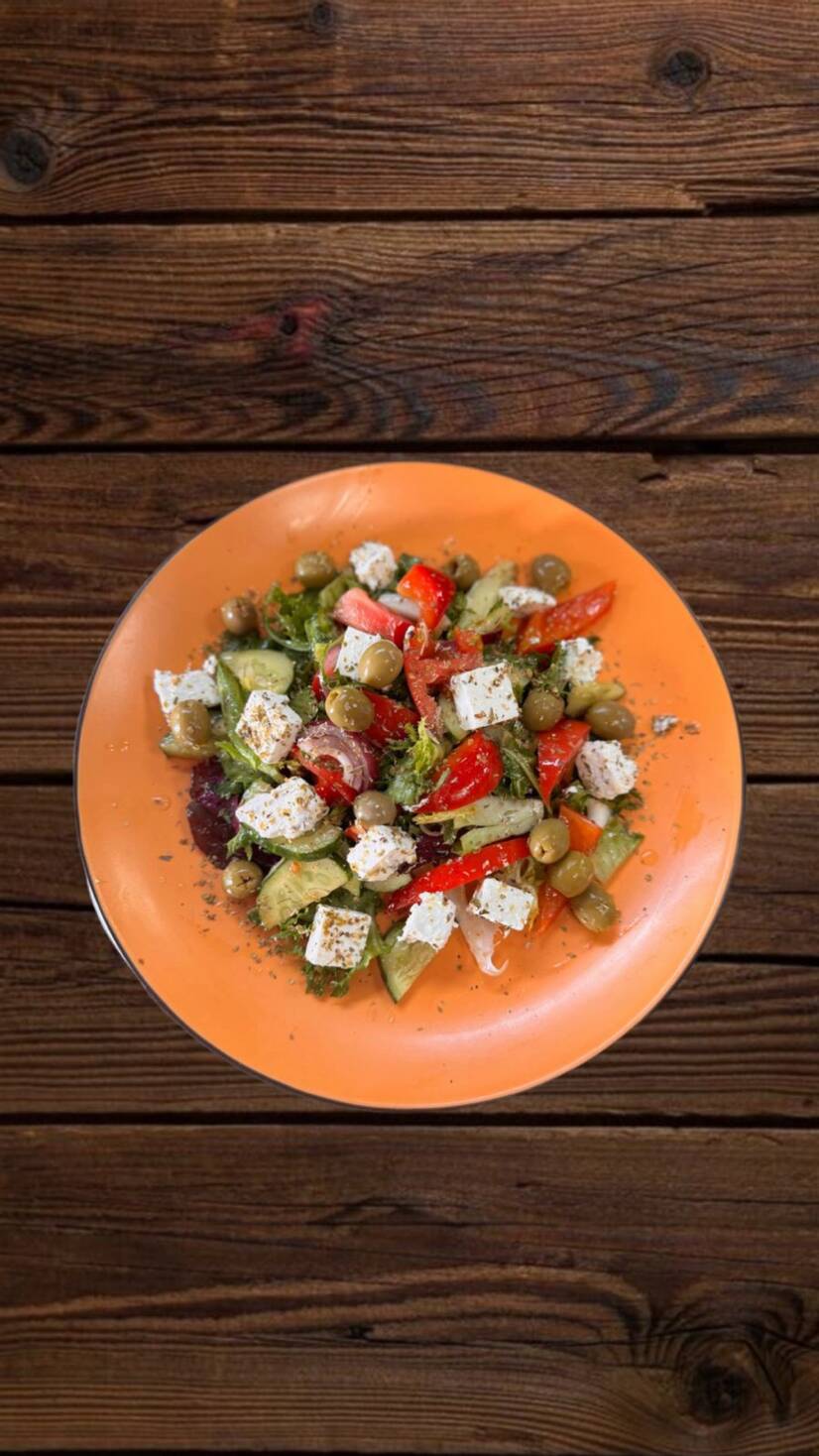 Мікс салату, огірок, помідор, перець боргарський , цибуля червона, сир фета, оливки, оливкова олія.