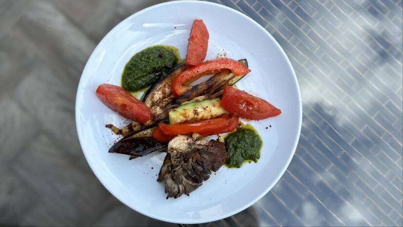 Баклажан, перець болгарський, томат, кабачок, гриби гливи, соус чимічурі.