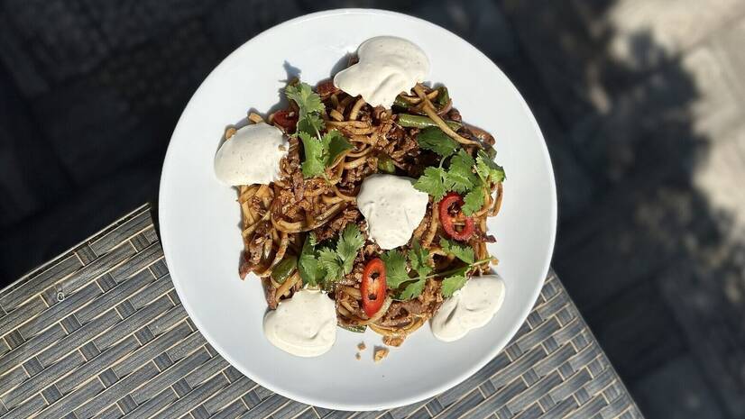Пшенична локшина, м'ясо яловичина, спаржева квасоля, цибулеві кріспи, цибуля марс, горіх кешью, мус трюфельний, кінза, перець чилі.