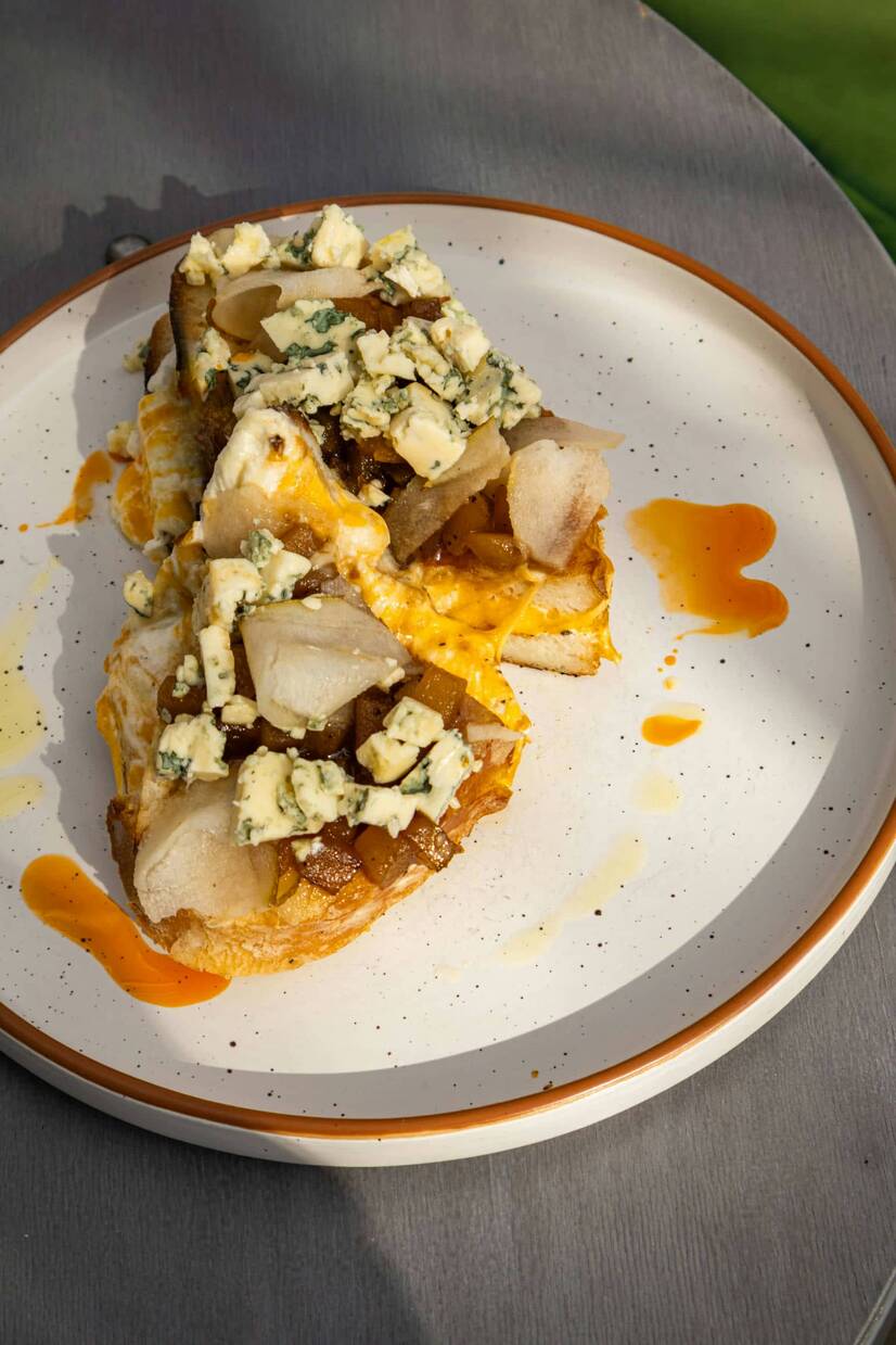 Шакшука з двох яєць, чоррізо, хліб.