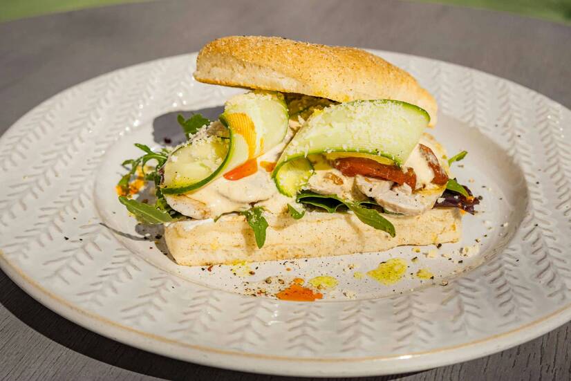 Булка бріош, спечений перець, пастрамі з індички, огірок, авторський соус.