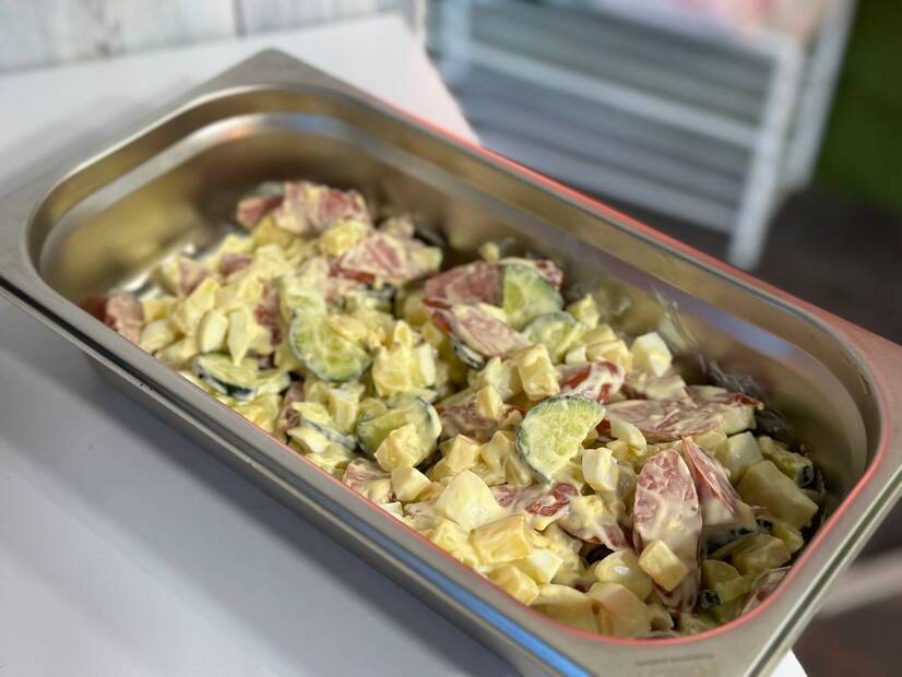 Картопля варена, мисливські ковбаски, яйця, кукурудза, свіжий огірок, цибуля, майонез