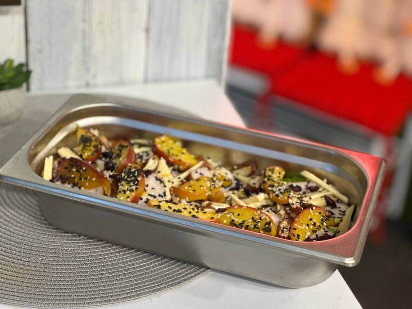 копчене філе, мікс салата, нектарин, фінік, сир, гірчиця, олія, мед, кунжут