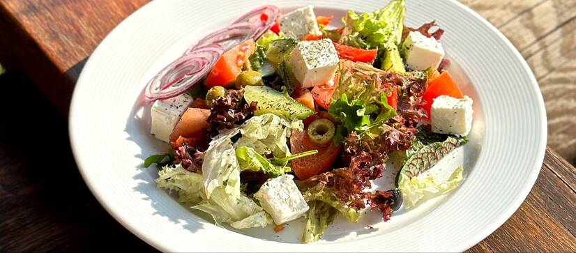 Сир фета, свіжі помідори та огірки, перець болгарський, кримська цибуля, оливки, маслини, оливкова олія.