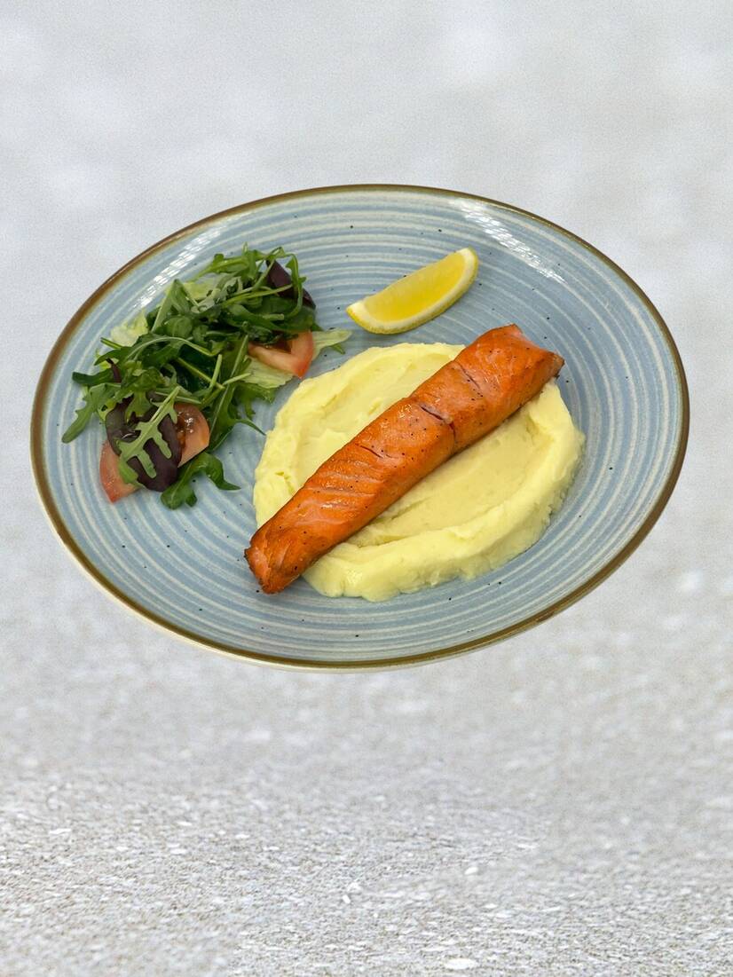 Лосось, картопляне пюре, салат мікс, томати, кунжут, лимон