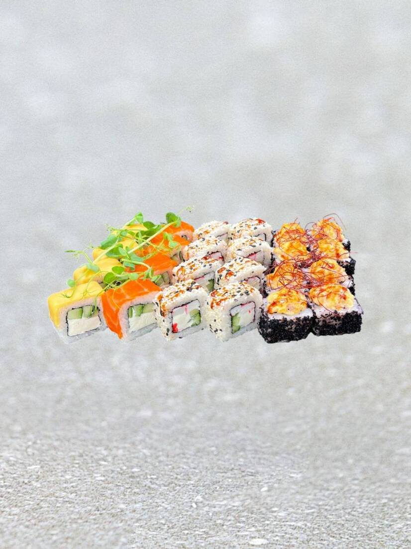 Філадельфія мікс з лососем та тостовим сиром, Філадельфія сезам з сурімі крабом, Які ікура з креветкою та тунцем