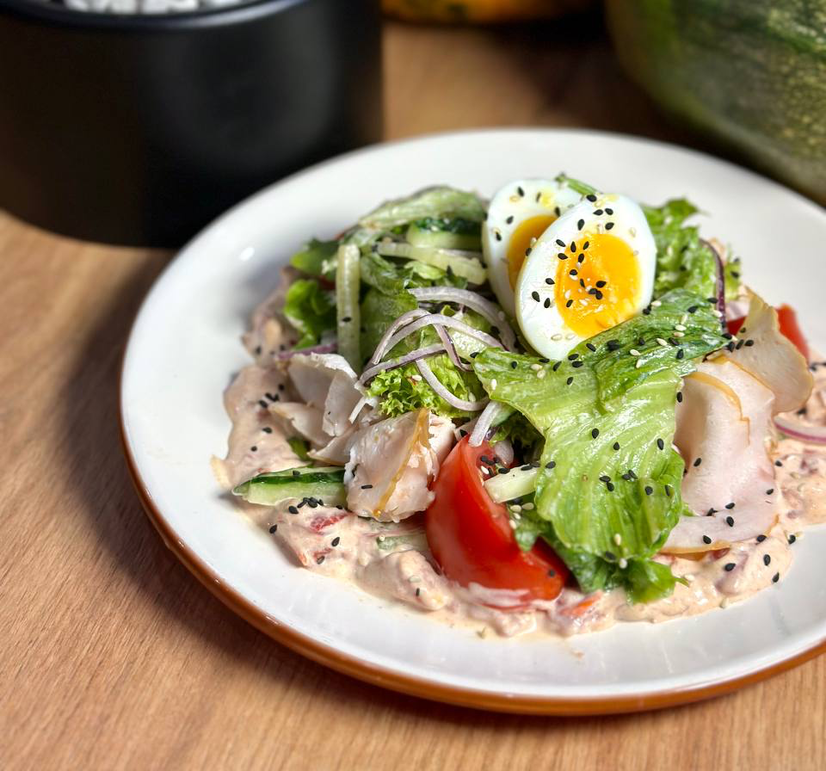 Соковиті шматочки копченої курки та свіжий мікс салату створюють ідеальну основу. Соковиті помідори та огірки додають свіжості, а відварене яйце робить салат ситним. Справжня зірка страви — це унікальне поєднання соусів: пікантного томатного айолі з нотками солодкуватого світ-чілі.