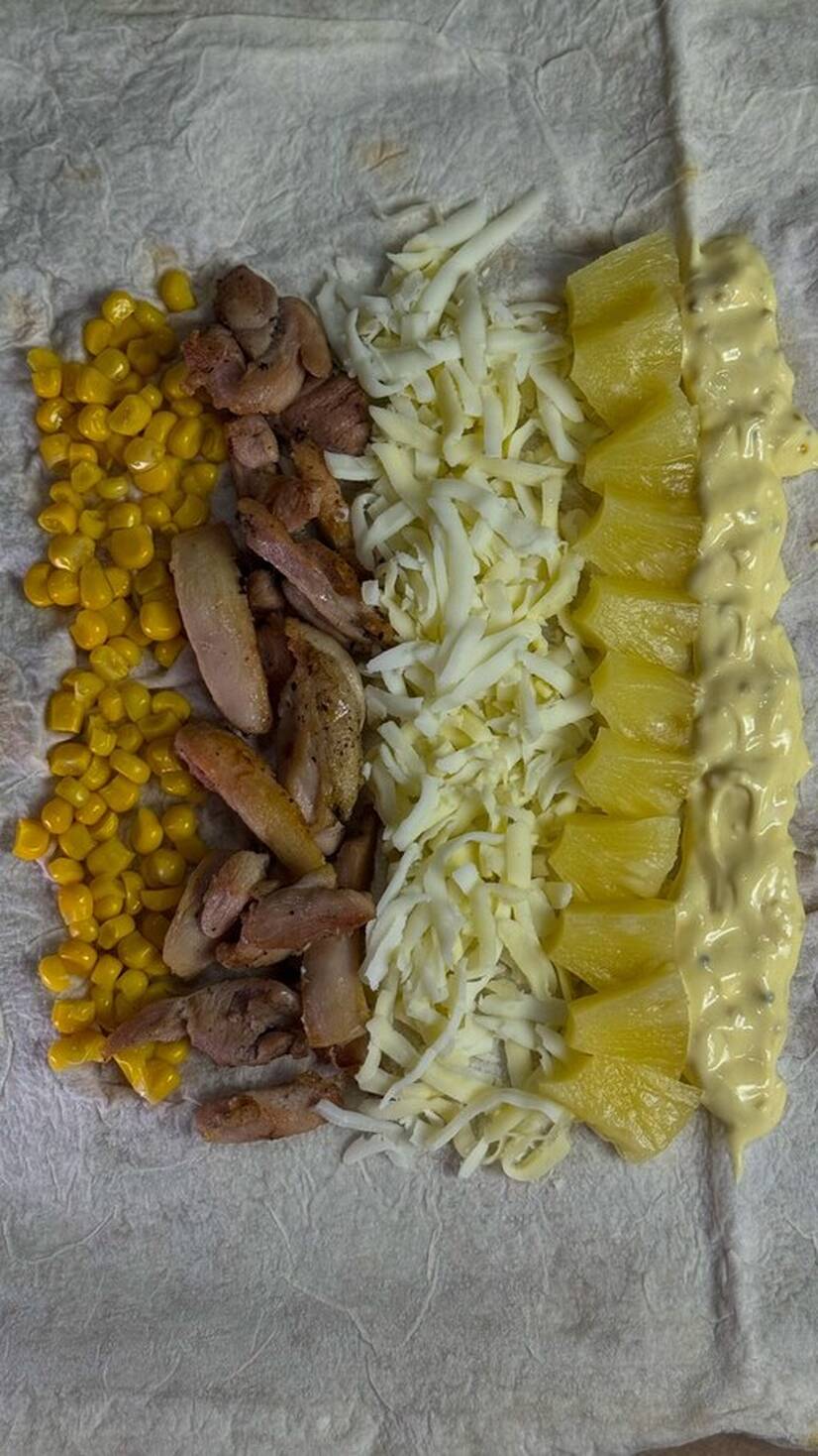 Підсмажена курка, соковитий ананас, солодка кукурудза, мікс сирів сулугуні та моцарелла, соус айолі.