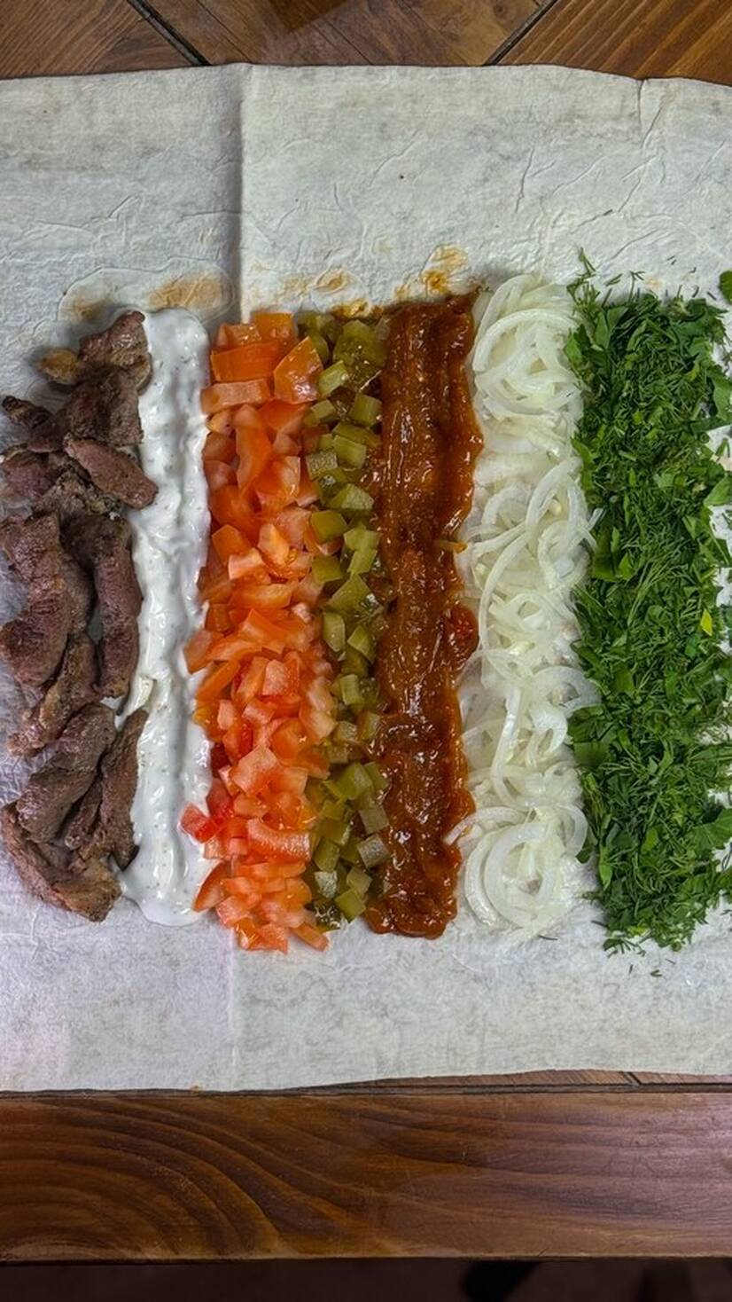 Соковита підсмажена баранина, свіжі помідори, солоний огірок, ріпчаста цибуля, ароматна зелень, пікантна аджика, часниковий соус
